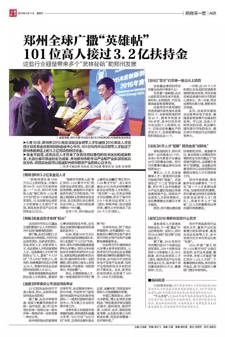 ▶5月10日,郑州市2015年度创新创业领军人才引进暨2016年度人才项目计划发布会在郑州国际会展中心举行,101位海内外高端领军人才接过了郑州市政府送上的3.2亿元项目扶持资金。