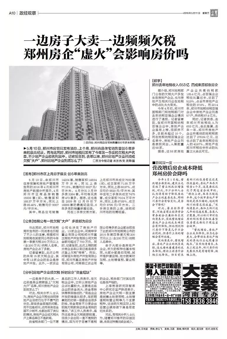 ▶5月10日,郑州市房管局发布消息,上个月,郑州商品住宅销售量创6年多来的最高纪录。而与此同时,郑州市地税局发布了今年第一季度的欠税大户名单,不少地产企业都名列其中。记者留意到,去年以来,郑州房地产企业已频成欠税“大户”,郑州房地产企业到底怎么了?