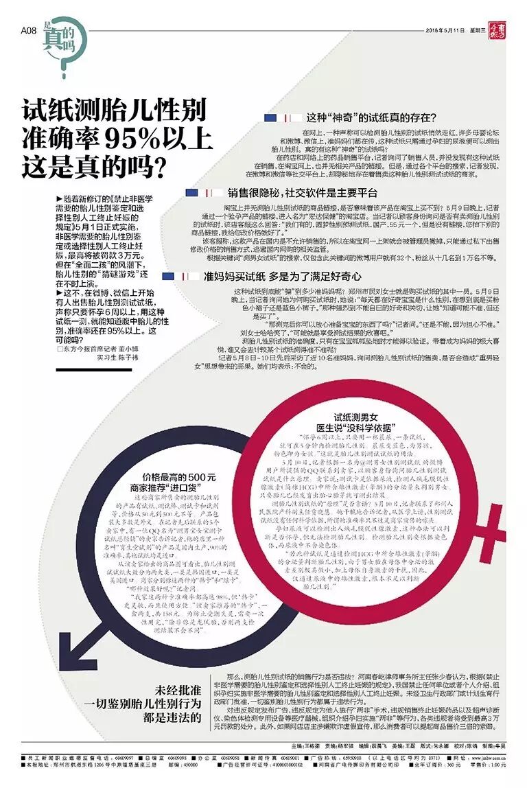 ▶这不,在微博、微信上开始有人出售胎儿性别测试试纸,声称只要怀孕6周以上,用这种试纸一测,就能知道腹中胎儿的性别,准确率还在95%以上。这可能吗?