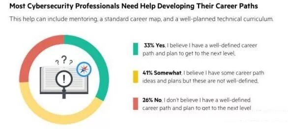 超过半数的受访信息安全人才将缺乏职业成长和上升通道作为离开这个行业的首要理由,另有20%的人才将其作为重要理由。根据信息系统安全协会2016年的一个信息安全职场调查报告,65%的受访者表示缺乏明确定义的职业道路(下图)。