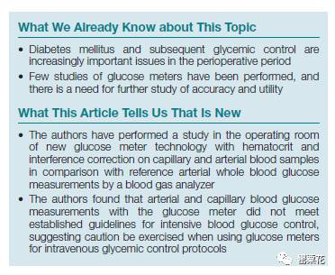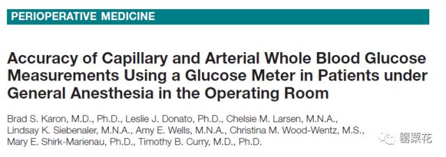 Karon B S, Donato L J, Larsen C M, et al. Accuracy of Capillary and Arterial Whole Blood Glucose Measurements Using a Glucose Meter in Patients under General Anesthesia in the Operating Room[J]. Anesthesiology, 2017.