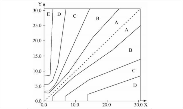 Parkers CEG图共分为A、B、C、D、E五区测试结果位于A 区为临床准确区,B 区为临床可接受区,表示对临床结局略有效应或无效应;而测试结果位于 C、D、E区, 则表示会导致临床结局风险增加。