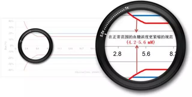 与ISO15197-2003 标准相比,ISO15197-2013标准的最低准确度要求更严格。当血糖浓度≥5.6mmol/L(100mg/dl) 时, 测试结果的最低准确度误差范围不得超过±15%。当 血 糖 浓 度<5.6mmol/L(100mg/dl)时,测试结果的最低准确度误差范围不得超过±0.83mmol/L(15mg/dl)新标准缩小了测试结果的误差范围,从而提高最低准确度要求。