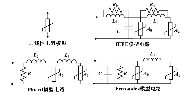 在EMTP中分别用非线性电阻模型、IEEE模型、Pinceti模型和Fernandez模型搭建MOA的仿真电路,四种模型的电路图如图1所示。