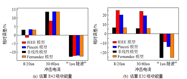 在8/20μs冲击电流下,非线性电阻模型和Fernandez模型有较高的准确性,相对误差不超过7%。而在30/60μs电流下,仿真模型估算吸能的准确性与阀片种类和冲击电流类型有关。在“1μs陡波”冲击电流下,除了IEEE模型估算E32吸能的相对误差为-8.67%,其他模型估算吸能的相对误差均超过-10%。