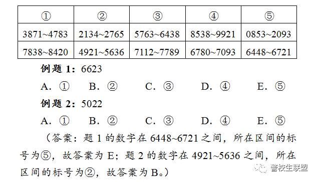 “数字定位”题型,先给出一个包含有一些数字区间的表格,在随后的每一道题目中都给出了一个数字,请你确定这个数字属于表格哪一数字区间,这一数字区间的标号就是正确答案。这类题目是“知觉速度与准确性”测试中难度最低的。答题时,不需要首先看“数字区间表格”,而是直接看小题,从小题中找到数字,按照从高位到低位的顺序在第一时间内完成。