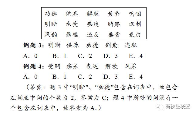 第二种题型:寻找相同字符数量。给定一个词表,要求你将每道题所给的五个词与词表中的词相对照,找出包含在词表中词的个数,如果所给的词没有一个包含在词表中,答案即为0。