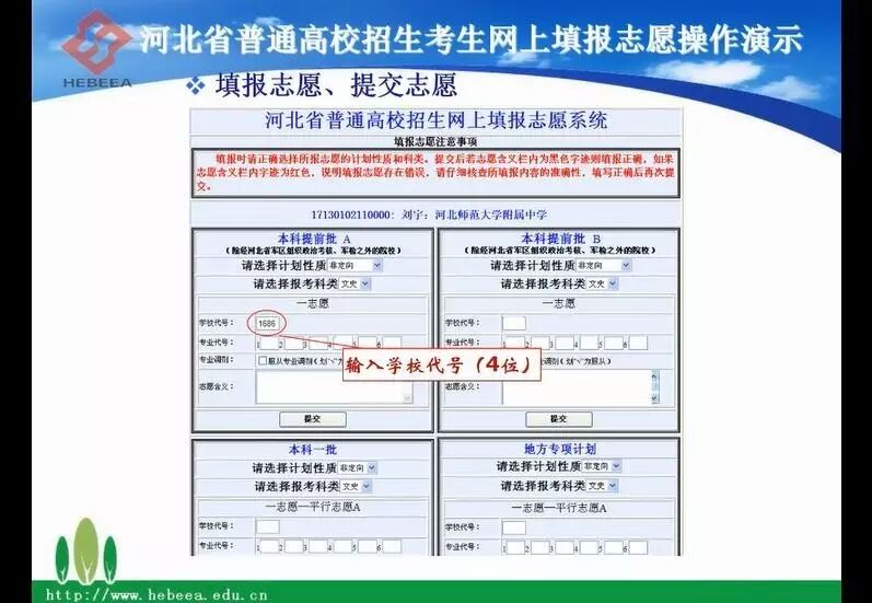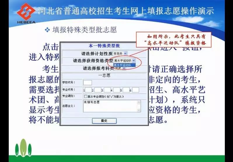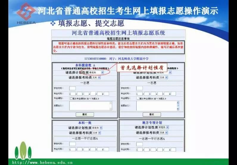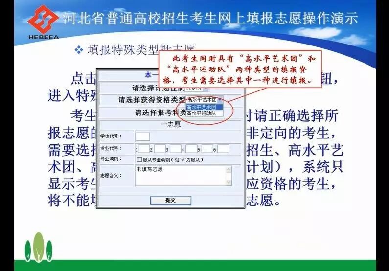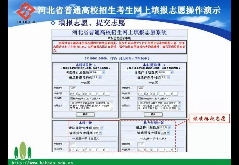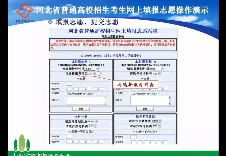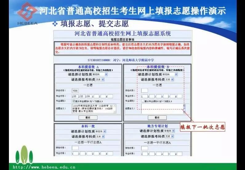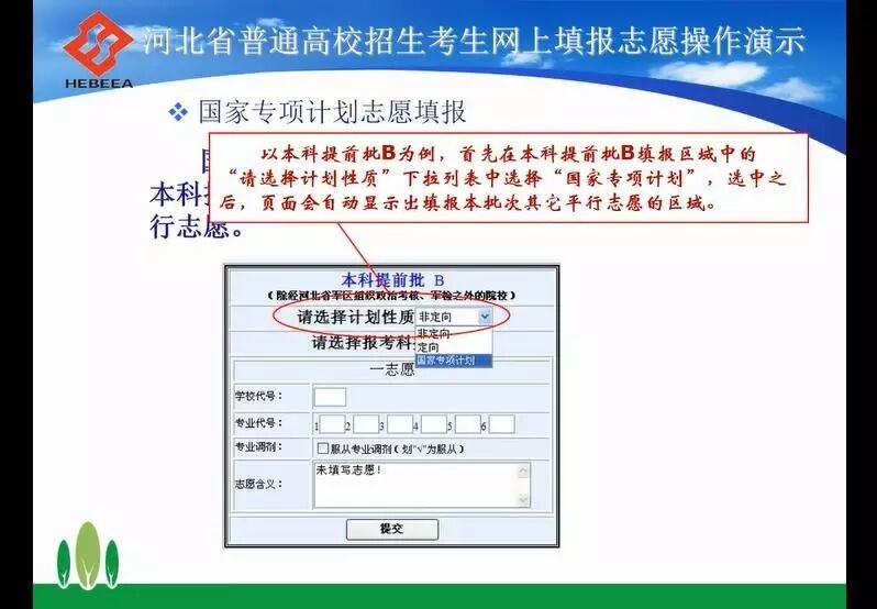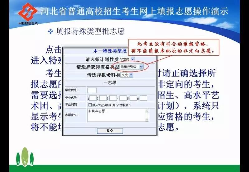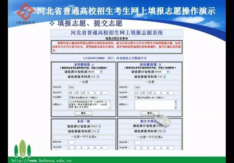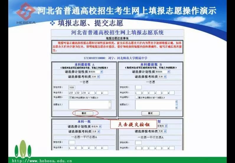 考生在选择批次、计划性质、科类、院校代号、专业代号(特殊类型批非定向志愿还需选择获得的相应资格)后,须点击“提交”按钮进行志愿提交。