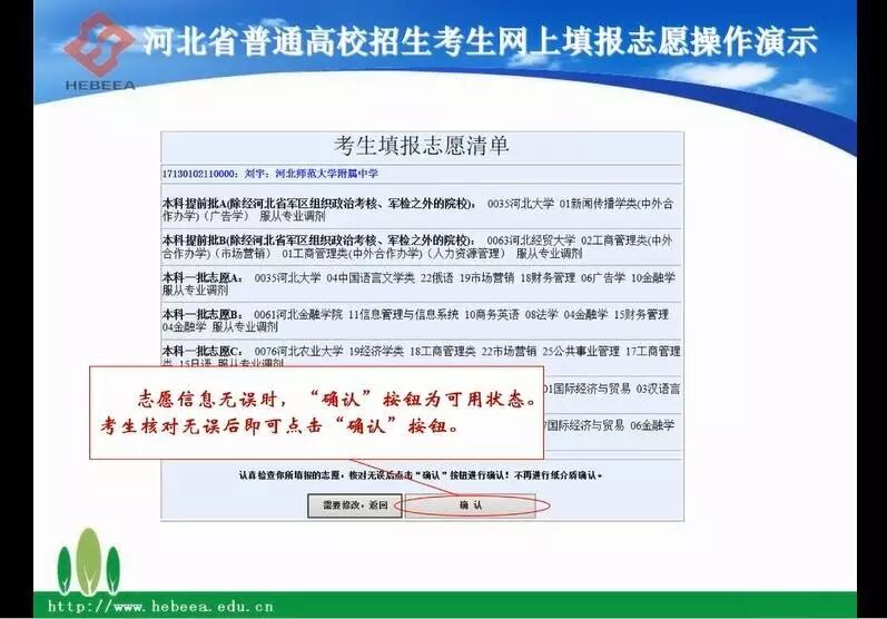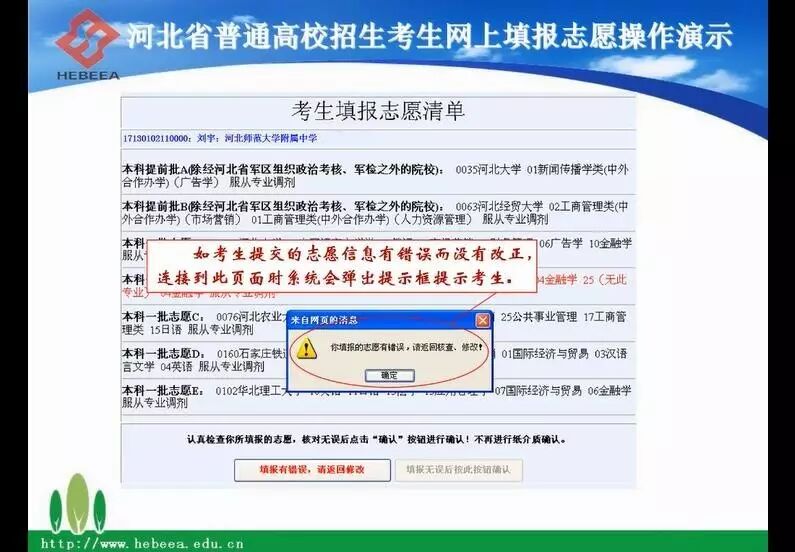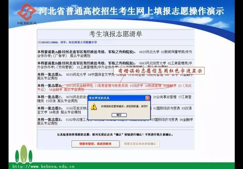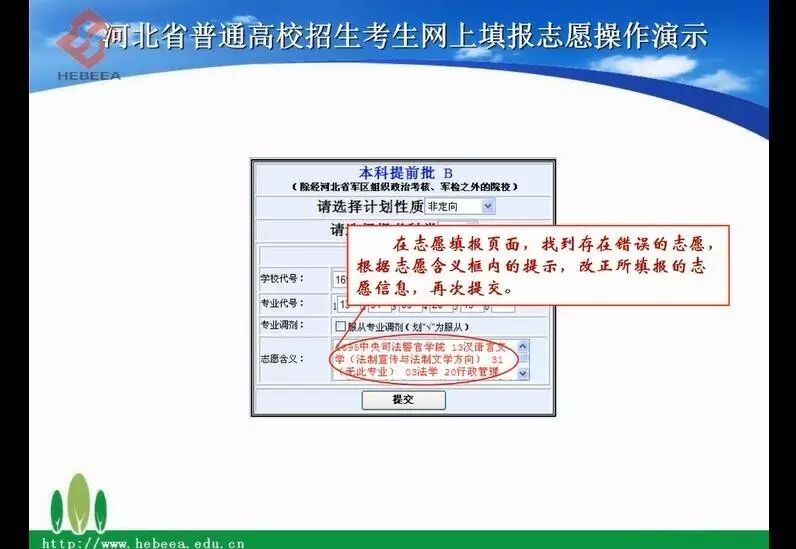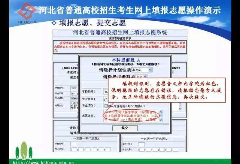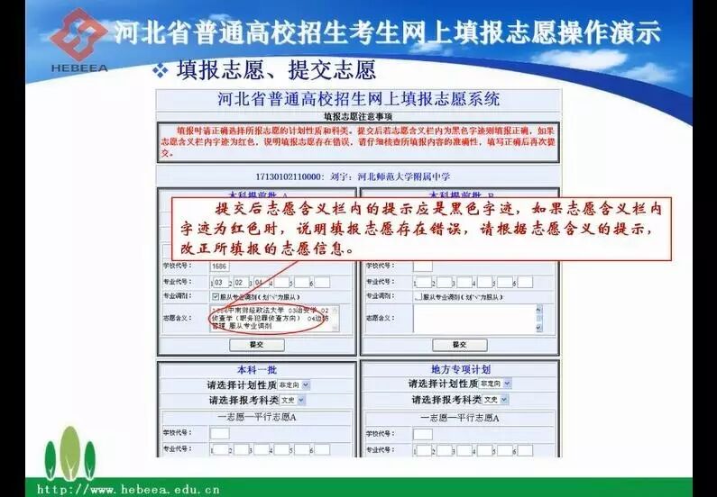 提交后若志愿含义栏内为黑色字迹则填报正确,如果志愿含义栏内字迹为红色,说明填报志愿存在错误,请务必按照系统提示仔细核查所填报内容的准确性,修改正确后须再次提交。