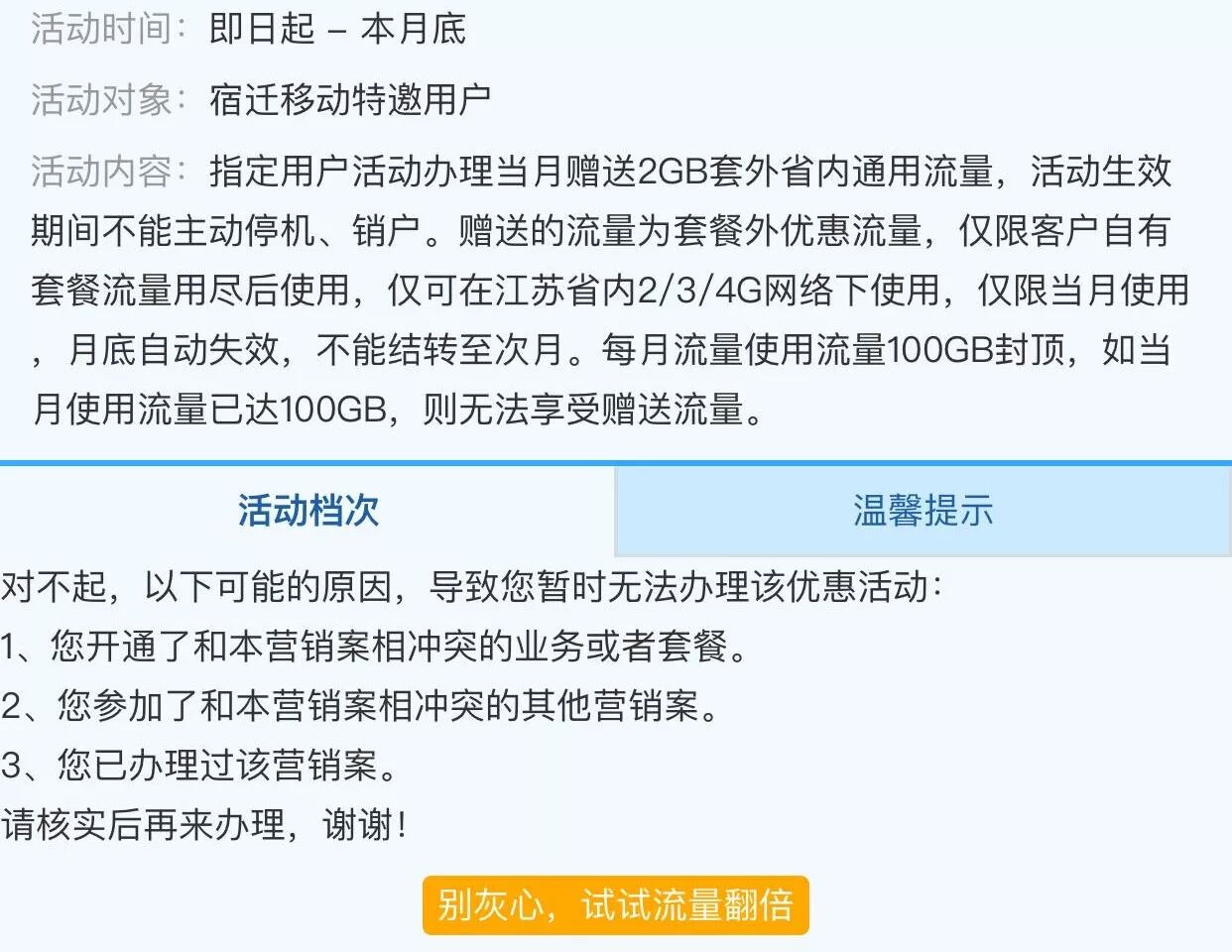 如果显示如下页面表示您没有抢到,您可以持续关注宿迁移动官方微信,后续还会有其它流量活动等您参加。