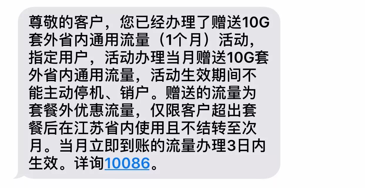5、所赠送的流量在您收到成功办理的短信提醒后三个工作日内到账,当月有效,不结转到次月,您可以登陆掌上营业厅进入流量专区查询,赠送流量为套外流量,且仅限在江苏省内使用,次月及次次月有流量赠送的流量到账时间为次月/次次月5号前。