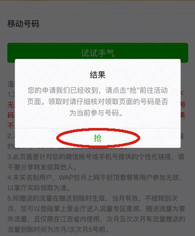 点击后会显示如下页面的领流量结果,点击“抢”按钮进入活动办理页面。
