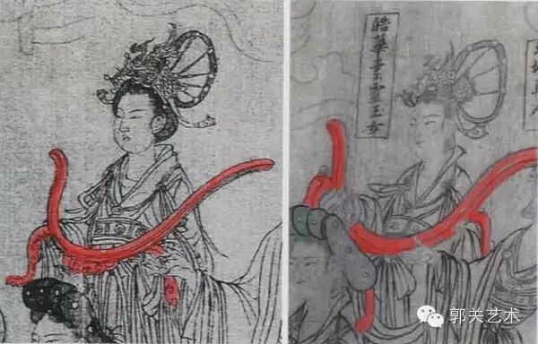 图2 扶桑大帝线条比较图,左《八十七》,右《朝元》 |
