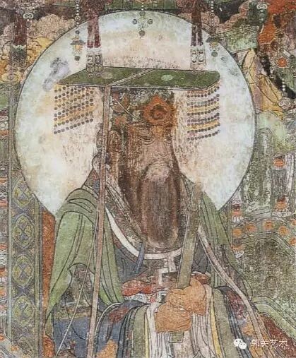 我认同《朝元》图原出自某道观东壁壁画小样的观点(如武宗元主持的玉清昭应宫)。在此基础上,我们再考虑全殿壁画的匹配,如果遵守一般的左右壁图像对称的原则,《朝元》图是东壁,而西壁除两位有头光的主神(西、北方帝君)外,能有谁与东壁的扶桑对应?如果没有对应者,只是所谓“五方帝”,为何将两壁壁画设计成主像不对称的形式?显然另有原因(下详)。