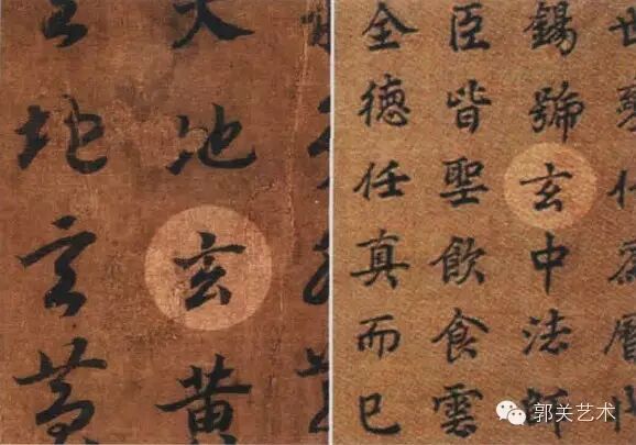 这里就又有一个问题了,即《朝元》榜题中的“玄”字。如前述,罗、徐、黄等人均已正确地指出,由于宋代避讳赵玄朗,“玄”字的使用只限在大中祥符五年以前(1012),恰好符合武宗元创作玉清昭应宫壁画的年代。而现存《朝元》上有7处“玄”字,也没有减少笔画。如果是武宗元以后的南宋摹本,如何理解这7个“玄”?我认为文字的避讳不可绝对化,南宋不同于北宋,现有证据表明,南宋是可以使用“玄”字的,如图12,左为南宋高宗赵构(1127-1162年在位)作《临虞世南真草千字文卷》局部(上海博物馆藏),[57]右出自南宋王利用画《写老君别号事实卷》(美国纳尔逊美术馆藏),[58]都有完整的“玄”字。王利用,绍兴年间(1131-1162)任秘书郎,其书画得高宗赏识。[59]这两例说明,至少在南宋初的高宗时期是可以使用“玄”字且不减笔画的,而这恰好是翟汝文活跃的时间。翟是文人出身,在北宋徽宗时期已是著名文士诗人,[60]又“精于篆籀”,除绘画和塑像外,当时还以书法闻名,得到书法家米芾的高度赞赏。宋代刘宰说他“尤工书,米芾惊叹,以为非唐贤所及。图画及刻塑皆精绝,为世所宝。”[61《]朝元》上榜题的书法水平,明显高于人物勾勒的线条。至于画卷上的“宣和”诸印玺,也可以因翟公“精于篆籀”而得到解释。当然,也不能排除后世作伪的可能性。由于翟汝文没有作品传世,他的画风不可知。作一般理解,还应属业余画家水平,低于武宗元这些当时一流的职业画家这也正好解释《朝元》的画技不高,与文献中的武宗元不相符的矛盾。当时马和之“效吴装,笔法飘逸”的画法得到高宗皇帝欣赏,王藏《朝元》正与之相似。