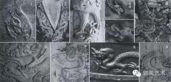 还有一些细节也有助于我们辨识二图的先后,即龙爪。已如前述,唐代的龙一般都是三爪,如图11中宋代的龙则四爪开始普遍,南宋陈容作《九龙图卷》的局部,[85]九条龙都是四爪。南宋《三官图轴》之《水官》也是龙伸四爪。其它宋代四爪龙如还有大足南山三清洞之龙柱等。而《朝元》之“太丹玉女”托盘上的龙,清楚显示为四爪。观察《八十七》相应位置的龙,只能见三爪。再比较爪之相对大小,则《朝元》的龙爪大得多,似乎是有意突出,以强调与以前(唐)不同。《九龙图卷》的龙爪也是很大,体现出宋代龙图像的主流趋势:由三爪变四爪且比例更大。显然,《八十七》中较小的三爪龙更符合唐之规格。再如前述,《朝元》的高度为58厘米,而北宋一般在53厘米以下,南宋的绢才变宽。《八十七》高度为30厘米,合乎北宋绢面尺寸。
