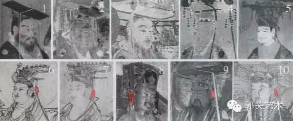 观察今存之唐代至明代服冕旒或通天冠的帝王图像,如图22所列10幅局部,1出自传为初唐阎立本的《历代帝王图》(藏美国波士顿美术馆),2出自莫高窟初唐220窟,3出自莫高窟盛唐103窟,4出自莫高窟晚唐156窟,5是莫高窟98窟五代时于阗国王像,6为《八十七》,7为《朝元》,8为南宋大足舒城岩造像,9出自元代永乐宫三清殿,10出自明代山西繁峙公主寺。初唐至五代的1-5图,黄主纩都不显,仅1图的耳边有一根细细的垂穗,下端吊一个大小如指甲壳的圆形物,应即黄主纩。其它莫高窟诸例(从初唐220窟到五代98窟)更是含糊不清,或许说明作为丞相的阎立本清楚冕旒制度,而偏远的敦煌画匠不清楚。反观《朝元》与《八十七》,东南二帝的黄主纩非常清楚,其大小如同拇指般。再看大足南宋舒城岩及南山例,以及南宋马麟画《夏禹王立像轴》(藏台北故宫博物院),黄主纩或更大于《朝元》。延至元代永乐宫三清殿壁画,黄主纩之大仍不减。直至明代山西公主寺(及石家庄毗卢寺)壁画,黄主纩才逐渐变小。因此,《八十七》之大黄主纩未曾见于五代以前,亦难见于元后,只在宋元间。