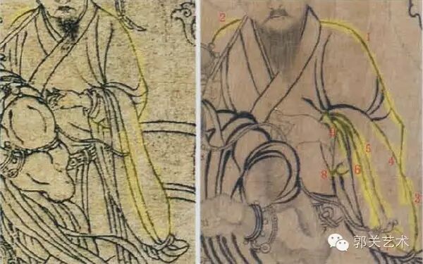 正如许多人早已指出的那样,两幅朝元图的线条的确有差异。徐邦达认为,《朝元》“衣纹笔法,流利壮健,有提捺,略似兰叶描法。”而《八十七》“衣纹作铁线描,没有提顿之笔。”[33]黄苗子认为《朝元》“线条清晰,气韵流畅,”“以流畅圆润的‘莼菜条’和顿挫有致的兰叶描,富于流动感,”而《八十》卷“多用游丝、铁线描,富于蕴籍感,”“用笔圆熟”。二图“笔墨上各有所长,工力悉敌。”[34]它们的差异是否仅仅表现为线条类型或风格?其线条的表现力是否真的不相上下?我们细作比较便可得知。如图8,仅以《朝元》右数第84号男仙为例,我们分析其中的9根主要衣纹线条,并和《八十七》的相应线条作对比。线条1的粗细变化没有道理,在下端的转折太硬且断气,下转后行笔太直,没有一气呵成,也没有体现身躯的转折结构。上端也没有考虑到两肩的联系,线条2显得过高,两肩不平衡。线条3、4与1的关系混乱,交代不清。线条5、6粗细变化无常、扭曲、软弱无力,且6中断后重新起笔为7,起笔又太粗,与6不能贯气。8处的两笔应为前臂衣袖的外轮廓,应与线条1的下端连成一气,但这一组本应相互照应的线条却毫无关系。线条9由上端起笔后转向变为莫名其妙的三根线。反观《八十七》的84号男仙,衣纹线条绝没有上述这些毛病,线条匀称劲挺,贯穿一气,相互关系交代清楚,决不含糊错位,形成一个相互联系的、体现对象结构的整体。虽然接近铁线描,但绝非没有提顿之笔。两幅画的风格确有动静之别,然而不能因此掩盖在线条功力方面的明显差距。无论兰叶描、铁线描还是其它描,写实性人物画的线条都必须符合三个方面的要求:首先要考虑到整体性和相互联系,即所谓“气韵”;要考虑到和表现对象的关系,即所谓“自然”;在技术要求上必须流畅劲健,即宋代所谓“用笔如折钗股、如屋漏痕、如锥画沙、如壁坼。”[35]线条散漫无序、转折无理、软弱无力的毛病并非唯一表现于84号男仙,《朝元》中的其他人物也普遍存在,此不赘举。