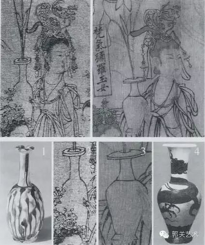 比较这两幅图卷中一个相同的人物手持的相同器物,即《八十七》中从右向左数第23位玉女(在《朝元》中为第22位“梵气弥罗玉女”),她们手中都有一个长颈花瓶。见图15,图中上部左为《八十七》之“梵气弥罗玉女”,图下部 2为其对应的花瓶,图上部右为《朝元》之“梵气弥罗玉女”,她对应的花瓶为图下部之3。2和3都是盘口长颈花瓶,但造型略有不同,而这一点外形的不同就显露了重要的时代差异,我们可以分别在唐、宋找到对应的来源。图下部1是一件8世纪的唐三彩长颈瓶(现藏美国波士顿美术馆)[83]下部2(《八十七》局部)与其相似;图下部4是宋代流行于北方的磁州窑长颈瓶(现藏美国纳尔逊博物馆),[84]与下部3(《朝元》局部)相似。从这两个花瓶的对比中我们不难看出:《八十七》更忠实地保留唐代成分,《朝元》则有更明显的宋代特征。其实并不止这一处区别,《八十七》画面上众多的器物都保留有更为明显的唐代特征。