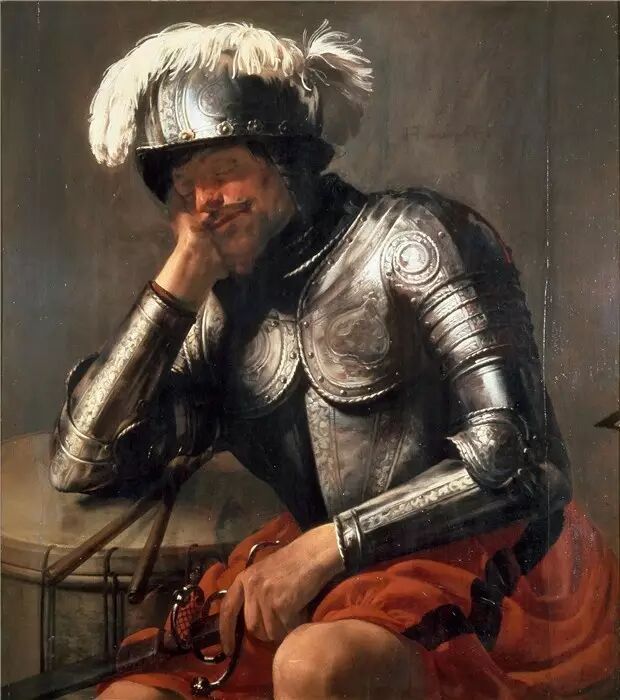 戎装两战神:有两幅戎装的两战神形象,分别是由亨德里克·扬斯·泰尔·布吕亨(Hendrick Jansz terbrugghen 1588–1629)和伦勃朗(Rembrandt Harmenszoon van Rijn,1606-1669)创作的。泰尔·布吕亨是17世纪欧洲北部卡拉瓦乔画派的主要大师之一。他的绘画风格和技巧主要受到了卡拉瓦乔的影响,不打草稿,直接在画布上创作油画,而且借取了卡拉瓦乔在光线明暗对比和平民化的风格特点。他于1629年创作的作品《睡着的玛尔斯》(图1-3 Mars 。这幅画作具有很强烈的平民化风格,这位睡着的战神不同于气势雄壮、剑拔弩张、怒目圆睁的传统战神形象,而是借助一位军人形象来刻画,着力描绘的是休息的战神,让人看到了战神的另一面。相比之下,伦勃朗表现的雅典娜这位战神,虽然在光影对比上更加有特色,但刻画的还是较为传统的雅典娜形象。在他的作品《帕拉斯·雅典娜》(图1-4 Pallas Athena)中,秀美的雅典娜紧握着长矛,显得坚定沉毅,她的头盔上有一只象征雅典娜的猫头鹰,黑色的盾牌遮挡住了三分之一的画面,但因为光线处理的问题,并不显得突兀。