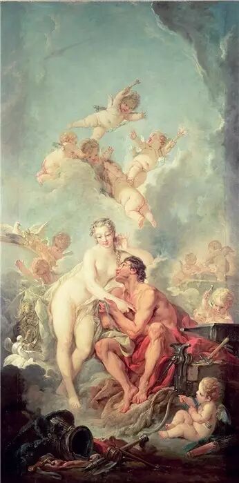 洛可可艺术大师布歇最擅长描绘的就是谈情说爱、偷情风流的故事,他用一种细腻和轻快的风格来表现人物的优美雅致。在《维纳斯与玛尔斯》(图1-6 Venus and Mars)这幅油画中,画中的维纳斯妩媚柔和,与旁边的战神玛尔斯形成鲜明的对比,画家用一种女性化的风格和玫瑰般粉艳的色彩来表现玛尔斯和维纳斯的风流故事。这幅画具有典型的洛可可艺术风格,即华丽繁复的装饰、曲线与弧线技巧的运用、纤巧轻盈的女性气质和田园牧歌式的情爱表现等。