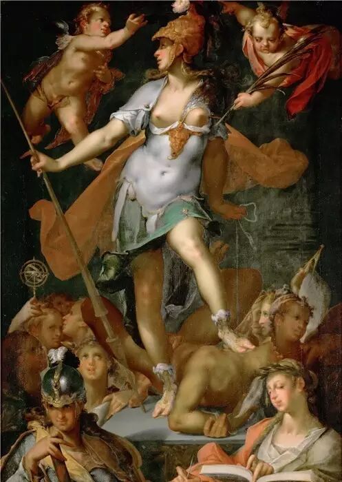 风姿两战神:佛兰德斯画家巴托洛默斯·斯普朗格尔(Bartholomeus Spranger 1546–1611)曾创作过表现玛尔斯和雅典娜两位战神风姿的最具风格的作品。其中《战场上的玛尔斯》(图1-1 Mars op het slagveld)与《胜利的密涅瓦战胜无知》(图1-2 Minerva Victorious over Ignorance)是一对作品。这两幅油画对人体的描绘具有很强的质感,在细节处理上极为精细,带有现实主义的美感。画中的玛尔斯充满了男性的阳刚气质,他高举着的盾牌和手中紧握着的长矛,显得魁梧,坚定和有力。雅典娜虽然右手拿着象征胜利的长矛,但还是呈现出女性柔美的一面。她身姿妩媚,脸庞娇小俊俏,左手拿着纺锤,脚踏看不清脸孔象征着混沌和愚昧的敌人,她身边的人,拿着象征知识的书本、圆规和球体,寓意着智慧和力量。