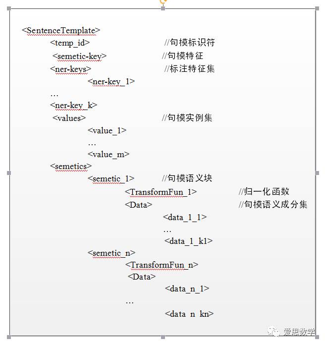 sematics 是由句模语义模块(sematic)构成的集合,句模语义模块是一个复合 结构,主要存放该句模的归一化函数(TransformFun)和语义成分配对数据(data)。 表 5-12 显示了例 5-5 的句模语义块。
