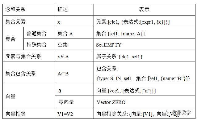 向量、集合等属于高中知识点,是以初中几何、代数等知识为基础的,在表示形式和逻辑关系上都比较复杂。如集合有交、并、补等运算形式,类似表达式, 可以将集合运算形式定义为“集合表达式”。集合运算的结果,仍然是一个集合, 因此,可以将单个集合形式与集合表达式一起抽象出集合的根对象(AbstractSet)。 集合关系运算(如集合相等、包含等)则类似等式、不等式关系,包含两个基本 的集合以及关系类型属性。集合、向量中存在一些特殊类型,如“空集”、“零向 量”等,可以利用对象的静态实例来表示。