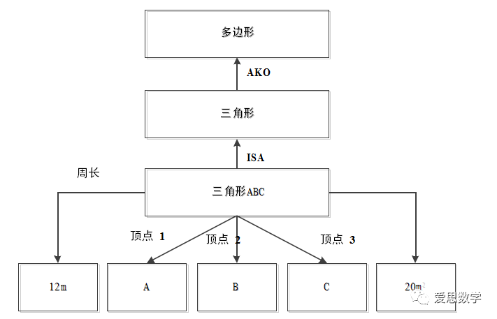 图 3-2 是一个语义网络表示的实例,其中,KAO 和 ISA 表示的实体间的类属关系,KAO(A-Kind-Of)表示“是一种”的含义,即三角形是一个种多边形,ISA(Is-a)表示“是一个”的含义,即三角形 ABC 是一个三角形。其余弧表示的是属性关系,如点 A 是三角形 ABC 的一个顶点。