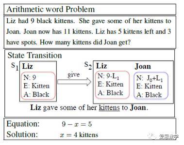 其次,在一定程度上理解文字之后,数学解题需要通过逻辑推理生成解题公式。如图2-1 Hosseni 2014的工作,把数学题通过自然语言处理得到几个变量状态之后,需要推理得到各个变量状态之间的关系得出数学公式。在他给出的例子中,计算机通过学习能得到动词“give”代表两个状态相减。