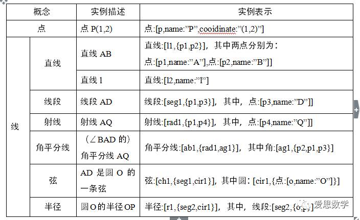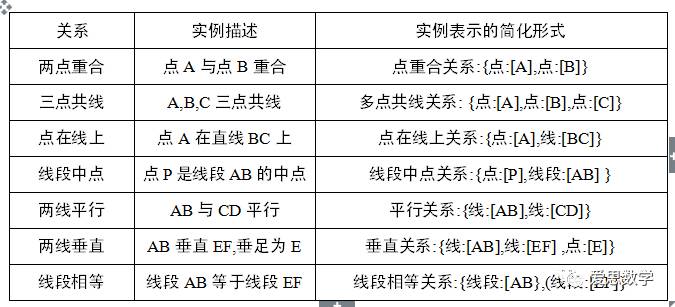 点与点、点与线以及线与线之间可以构成很多基础的关系,如两点重合、三点共线、点在线上、线段中点、线段相等、两直线平行、两直线垂直等。表 3-2 显示了点、线组合形成的关系对象及其所含数据项内容,由于实例表示比较复杂, 不再显示关系实例的完整实例表示,内部的概念实例表示也采用简化形式。