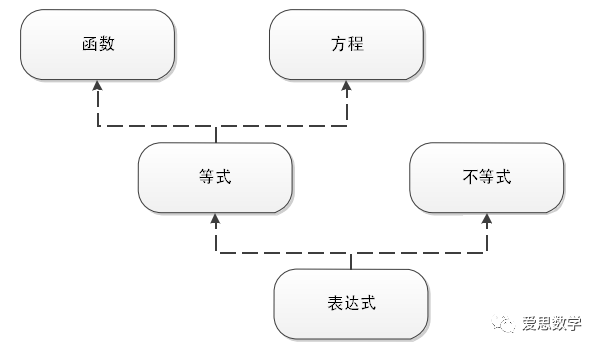 代数知识表示的基础概念是表达式,表达式主要由常数(整数、实数等)、变 元(字母形式)以及运算符等符号构成,如 x,kx+1,(x+1)*2 等。表达式通过关 系符可以构成复杂形式的对象,包括等式与不等式、方程与函数以及更为复杂的方程组与不等式组等。图 3-6 显示了代数基本概念的结构。