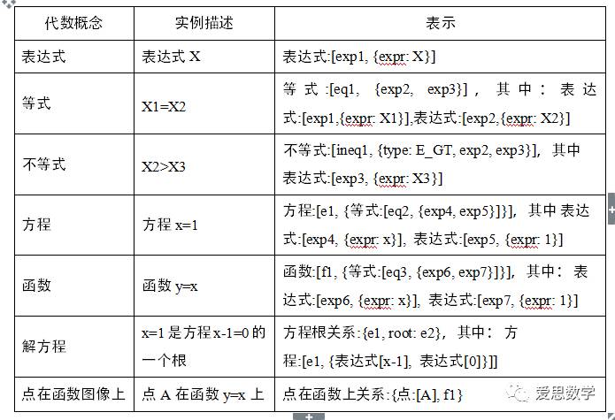 实际上,方程与函数都是一种等式,即含有变元的等式。进一步的,函数是 含有多个变元的方 程,如 “ 一次 函数 y=kx+b” 变换后变成 “ 二元一次方程 kx-y+b=0”。可以看出,代数知识之间的关系是灵活多变的,并不像几何知识那样清晰,表 4-3 显示了一些基本的代数概念和常见知识的表示及实例。可以看到, 表达式是最基本的代数元素,不等式“X2>X3”有两个表达式对象构成,将“>” 抽象成一种属性,用 type 定义,E_GT 表示大于的含义,这样,不等式关系对象中, 两个表达式成分被 type 限定,不能随意交换。不等式“X2>X3”形成的知识对象 为“不等式关系:[ineq1, {type: E_GT, [exp2,{expr: X2}], [exp3, {expr: X3}]}]”。