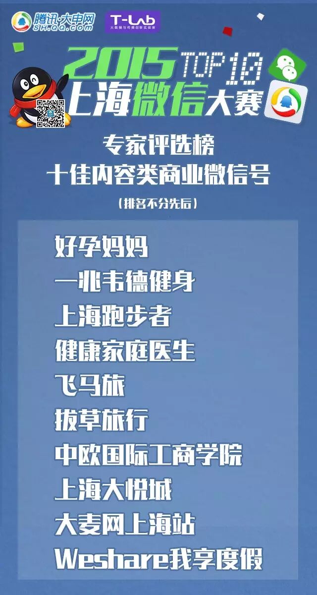 今天,由专家评选出的2015上海十大微信公众号五大类(政务、大众媒体、自媒体、商业、服务功能)10强榜单新鲜出炉(榜单如图)。网友投票生成的“票选十佳”昨天已经诞生(榜单如图)。