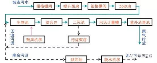 污水处理厂中控系统主要是对格栅渠、格栅间、提升井、预处理池、沉淀池、过滤池、中水提升池、生物池、中水池和设备间及污泥脱水间、加药间等设施的自动监控。其生产工艺流程图如下所示: