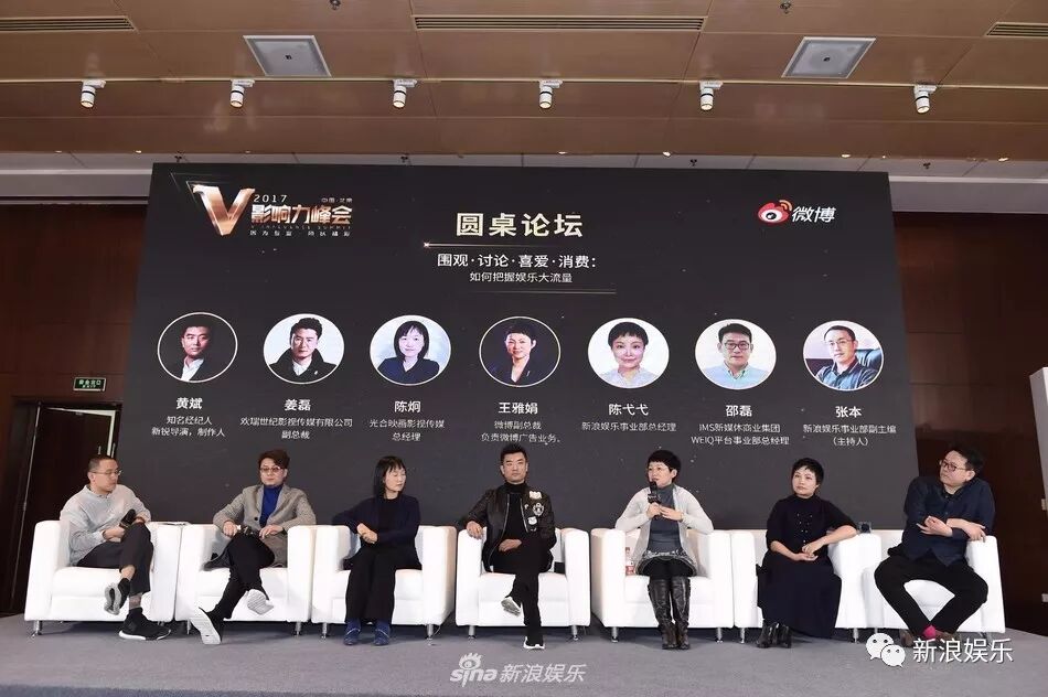 现场座位顺序从左至右依次是:新浪娱乐事业部副主编张本,欢瑞世纪影视传媒有限公司副总裁姜磊,光合映画影视传媒总经理陈炯,赵丽颖经纪人黄斌,微博副总裁负责微博广告业务王雅娟,新浪娱乐事业部总经理陈弋弋,IMS新媒体商业集团WEIQ平台事业部总经理邵磊。