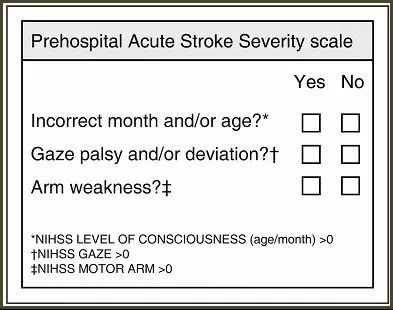 2016 年 7 月,在一项丹麦国家脑卒中中心的大样本队列研究中,其设计并验证了 Prehospital Acute Stroke Severity(PASS)量表,该量表仅仅纳入了意识水平提问、凝视和上肢肌力三项评估项目(图 4)。