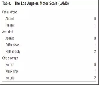 2008 年 Bijen 等研究者设计了一个供院前和门诊使用的评估量表 Los Angeles Motor Scale(LAMS)量表(图 2),该量表纳入面瘫、上臂抬起、握力三项。