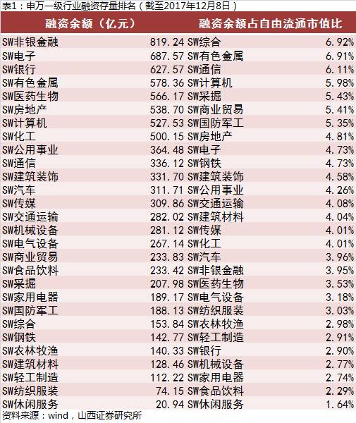 截至2017年12月8日,融资市场中非银金融、电子、银行、有色金属、医药生物等行业融资余额居前。若以融资余额占自由流通市值的比例来衡量杠杆资金的占比,综合、有色金属、通信、计算机、采掘是目前杠杆做多资金占比较高的行业,杠杆资金达到5.40%以上。
