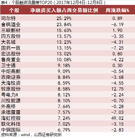 个股方面,若以融资净买入额占周交易额比例作为看多指标,2017年12月4日-12月8日期间,比例前20个股分别为司尔特、金枫酒业、三峡新材、四方股份、大名城、国药一致、宏达股份、鲁商置业、卫士通、中炬高新、西南证券、天海投资、牧原股份、粤电力A、川投能源、外高桥、承德露露、海虹控股、联化科技、中钢国际,近两周可关注个股表现。