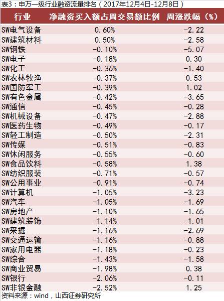 行业方面,若以融资净买入额占周交易额的比例作为看多指标,2017年12月4日-12月8日期间行业净融资买入占周交易额比例前五的行业中仅有电器设备和建筑材料为正数值,一周涨跌幅分别为-2.22%、-2.58%。