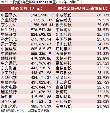 统计融资融券个股标的存量方面的数据,截至2017年12月8日,中国平安、兴业银行、京东方A、民生银行、中信证券等20只个股融资余额居前。若以融资余额占流通市值的比例来衡量杠杆资金的占比,中成股份、全柴动力、创元科技、中远海科、乐凯胶片等20只个股是目前杠杆做多资金占比较高的股票,杠杆资金的占比达到21.90%以上。