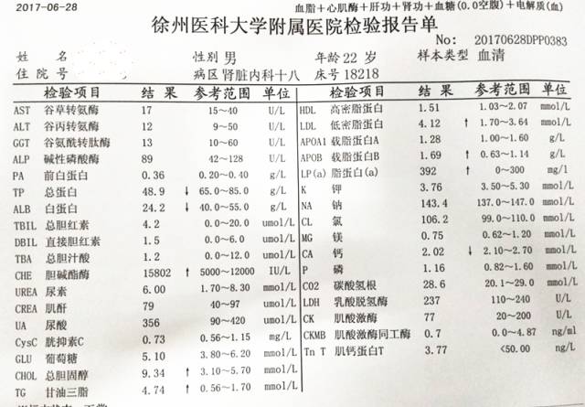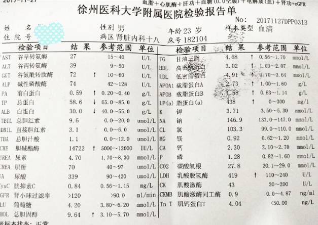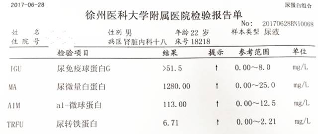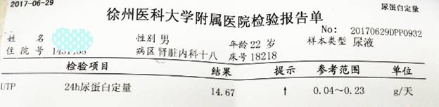 3.大量蛋白尿:尿蛋白4+,24h尿蛋白定量 :14.67 g/天(>3.5g/天);