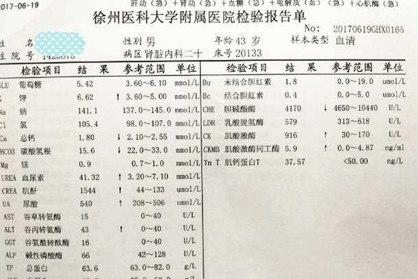 2.血肌酐1544umol/L,尿素41.32mmol/L;
