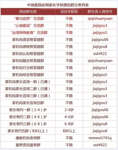 备注:为造福更多星儿家庭,特创建“爱与自然”交流群、“心做图说”交流群、“台湾特殊教育”交流群,让更多孩子在“爱与自然”中开花结果!家机构感统帮答疑群、语言帮答疑群、认知帮答疑群、融合帮答疑群和行为帮答疑群注重个性化针对性服务!家机构综合帮答疑群集语言、感统、融合、行为和认知五大领域进行答疑!家机构家长咨询一群、二群、三群、五群聚集来自全国各地的2000多名星儿家长,为星儿家庭提供交流与互动的园地,共同为星儿成长不断努力!家长有约一群、二群、三群、五群,请各位家长按孩子的年龄段,联系各个群负责人邀请入群!康教机构老师群可进行教学交流!星界资讯服务群—生活好帮手,资讯共分享,自闭症家庭生活互助平台!