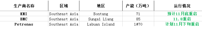 外围方面,目前文莱BMC已重启,KMI、马油小装置11月底也计划重启,在经历10-11月份的进口低谷期后,预计未来进口量将回升。