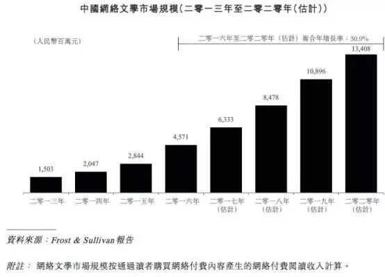 中国文学市场的规模在2013年为297亿元,2016年为403亿元,年复合增长率为10.7%。招股书指出,其中中国网络文学规模增长最快,年复合增长率达到44.9%,2016年市场规模为46亿元,占中国文学市场总规模的11%,未来四年的复合增速在30%以上,预计占比将持续扩大。