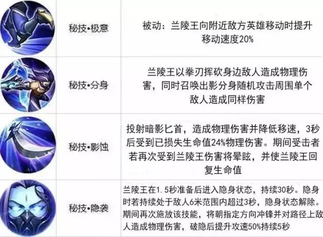 兰陵王拥有非常优秀的偷袭能力,GANK能力满分~玩兰陵王想赢就务必在前期为团队建立优势,在经济占优时兰陵王绝对是无人能挡的。切记,杀人要转化为推塔,只杀人不推塔节奏拖入后期就会很疲软哟!