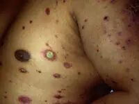 8.二期:螺旋体从淋巴系统进入血液循环,在全身播散后出现全身症状,感染后7~10周出现低热、头痛、肌肉和关节痛,也可以有肝脾肿大和全身淋巴结肿大。二期包括:疹、复发性疹、黏膜损害、性脱发、骨关节损害、眼、神经、全身浅表淋巴结肿大。