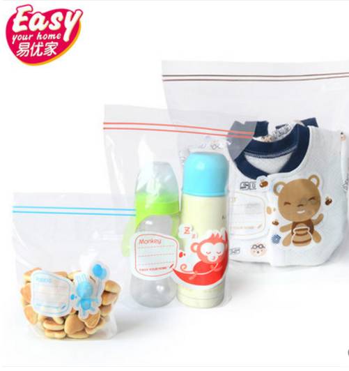 密封袋可以很好地将孩子的物品与细菌隔离开。我一直用的是易优家的,他家的价格不便宜(我通常是双11或者做活动的时候抢购),但是质量确实不错。同样,它也有很多种大小型号,最小号的我一般用来装分装的零食,比如葡萄干。因为有些零食一包的量很多,我为了不让阳吃那么多,每次都会给他分装一小包,告诉他今天就只有这一包,他可以自己决定什么时候吃,吃多少,但是吃完就没有了;中号的我一般就拿来装当天在路上吃的水果(出发前洗干净),或者用来装尿不湿(根据宝宝一天的用量,我阳宝是一天4-5片),这样放在妈咪包里就不用担心会被污染了;而大号的一般就是分装阳宝的干净衣服,不管是放在行李箱还是妈咪包里都很好找,另外,我习惯装一套衣服放在妈咪包里备用,因为阳宝喜欢在地上打滚,有时也会要玩水玩沙,所以有了备用衣物可以及时更换。宜家的密封袋相对较薄,但胜在价格,所以我一般用它来分装阳宝的玩具,有时也会装水果。